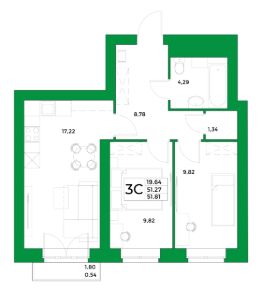 - жилая площадь 19.64 кв. м., кухня 17.22 кв. м..
