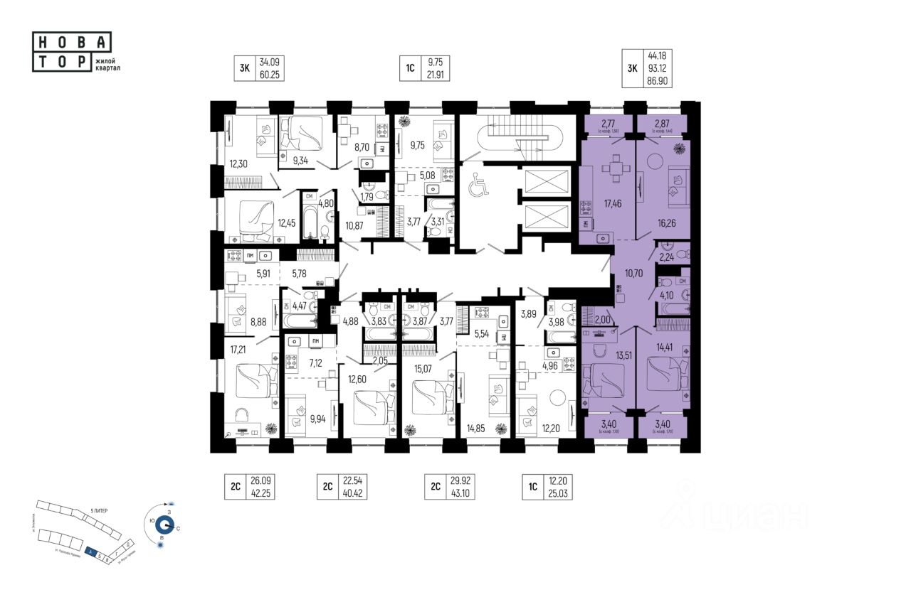 Литер 1, Секция 1. 16-й этаж 19- этажного жилого дома