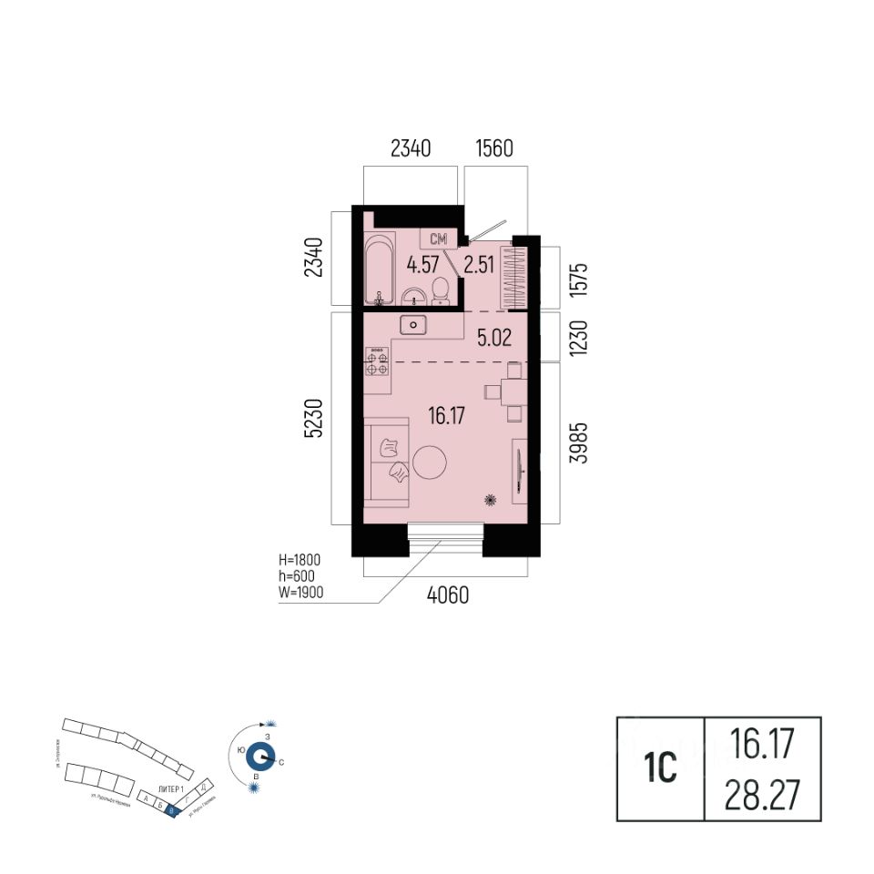 Общая площадь 28.27кв.м.;