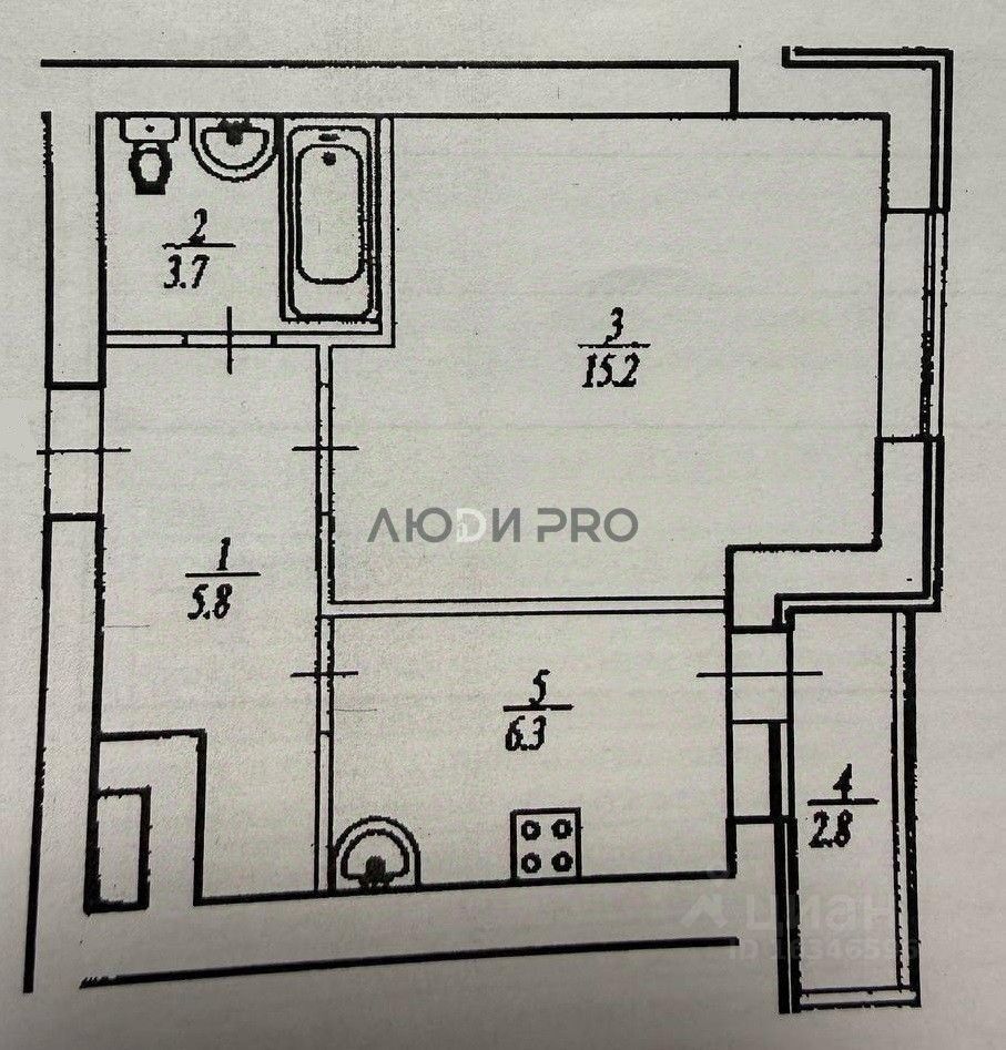 Общая площадь квартиры по выписке 31 кв.м, комната 15,2 кв.м, кухня 6,3 кв.м, санузел совмещённый.