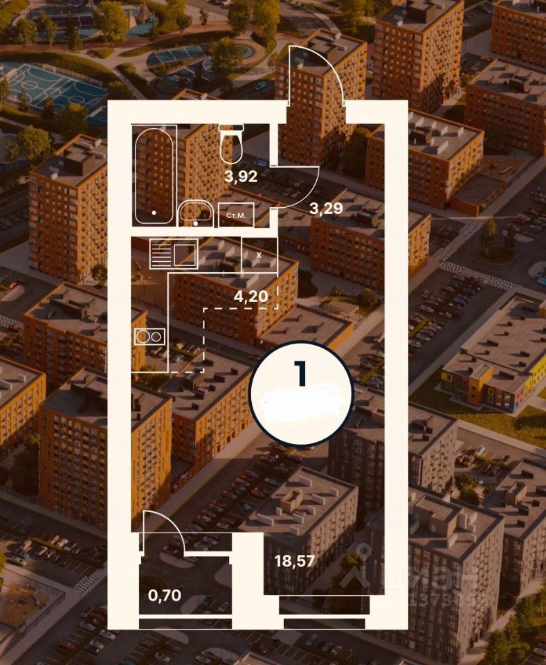 Общая площадь квартиры 26.1 кв.м. Находится на 12- ом этаже 16-этажного монолитно- кирпичного дома, 2022 года постройки.