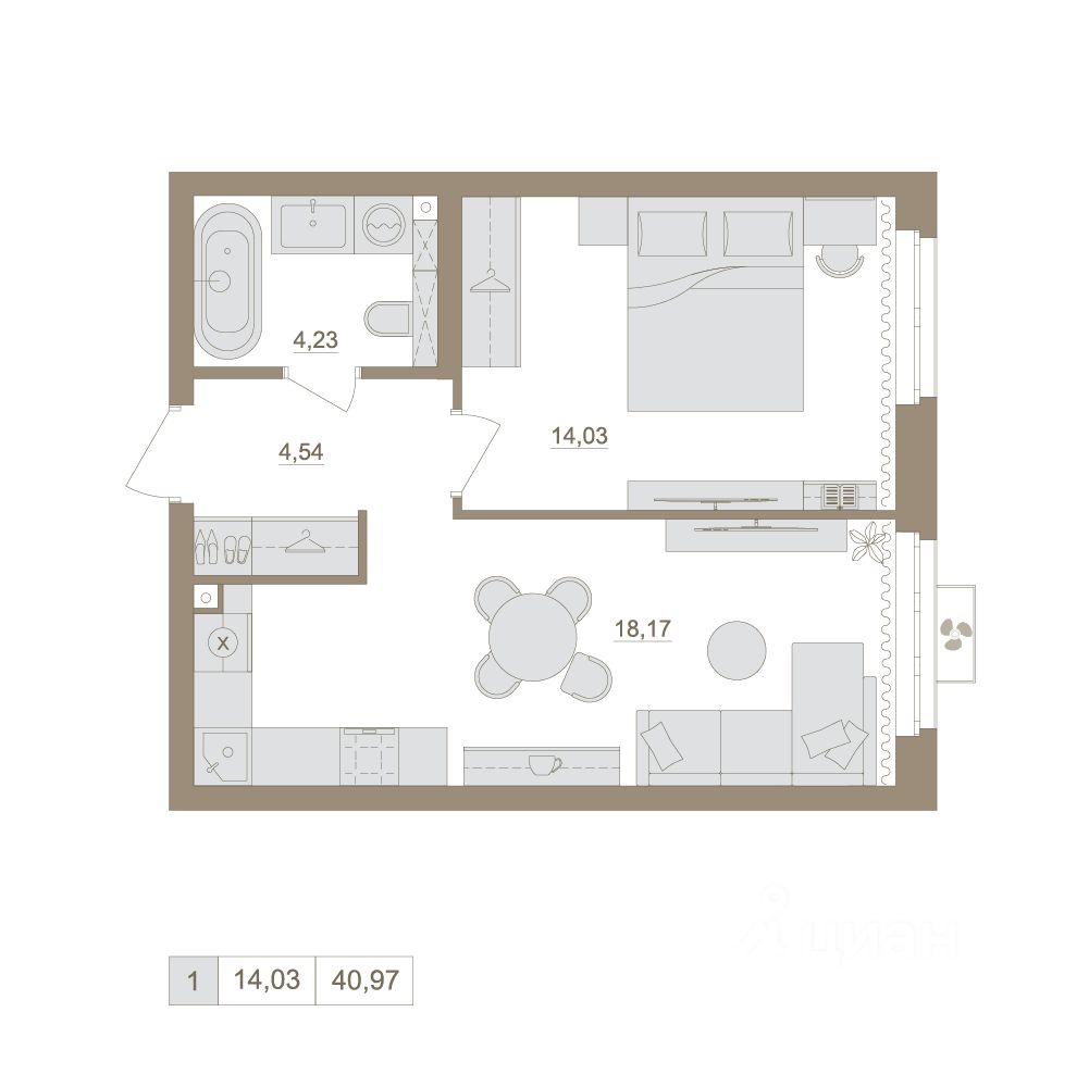 Общая площадь40,97 м²