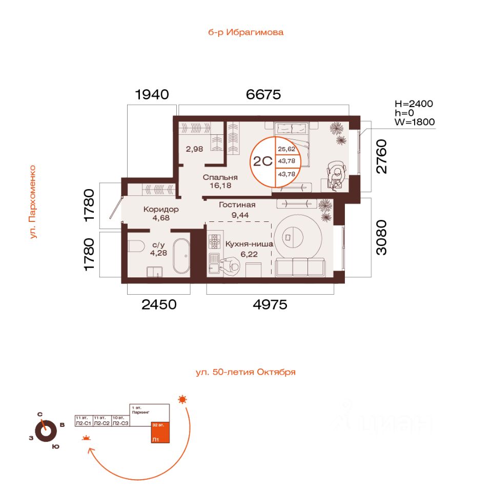 Общая площадь 43.78кв.м.;