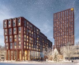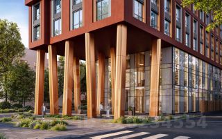 - Узнаваемая архитектура. Эстетичный дуэт: башня высотой 100 метров и 12-этажная секция с монументальными медными колоннами.