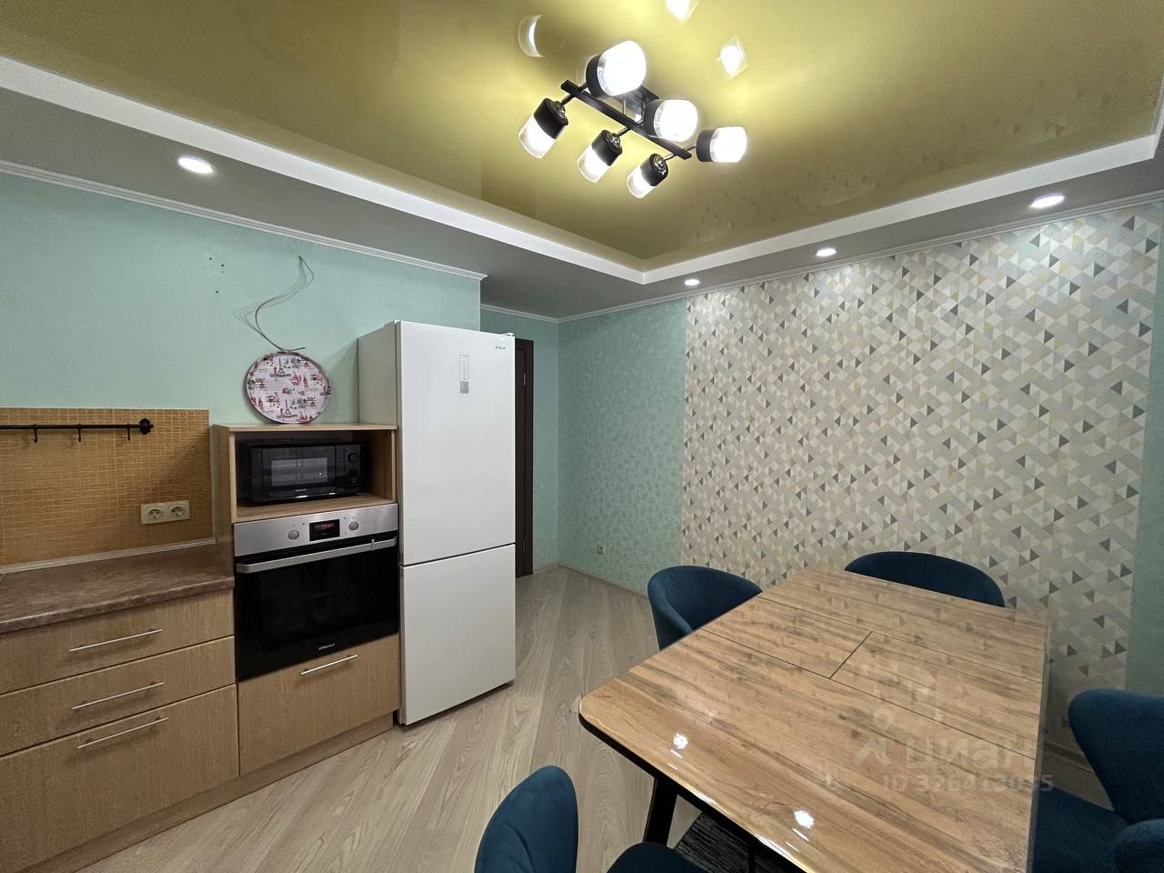 Качественный ремонт: выровненные стены, поклеены обои, матовые натяжные потолки (на кухне двухуровневый с подсветкой).