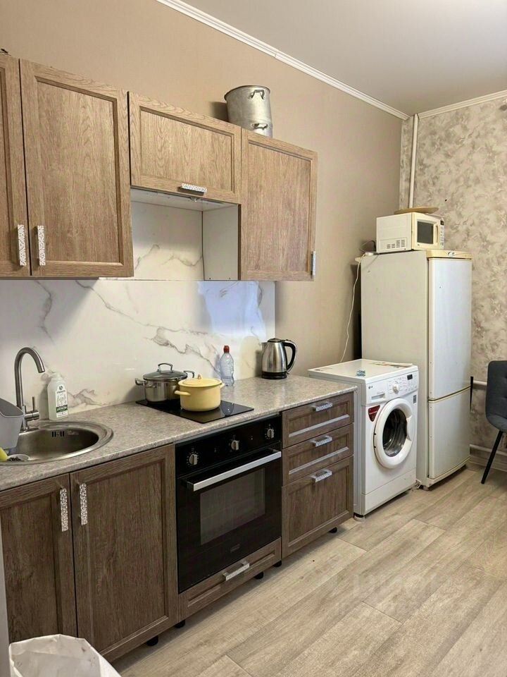 В комнате сделан ремонт, установлен кухонный гарнитур, электрическая плита, холодильник, раковина, стиральная машина.