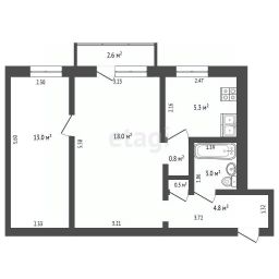 Площадь квартиры 43,8 квадрата. Комнаты 18 кв.м. и 13 кв.м. Кухня 5.3 кв.м.