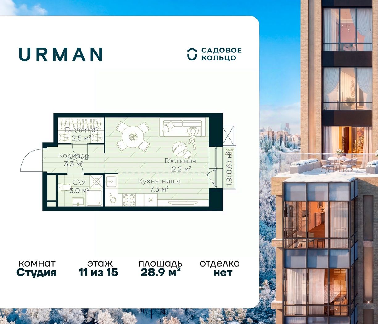 Продается квартира в ЖК Urman City студия на 11 этаже 15 этажного дома. Общая площадь: 28.9 кв.м. Высота потолков 2.95 м. Срок сдачи 1 квартал 2028 г. Эскроу-счет. Застройщик ГК "Садовое кольцо".