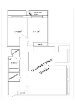 Общая зона (зал + кухня): 43 м² — просторное место для встреч, отдыха и готовки.
