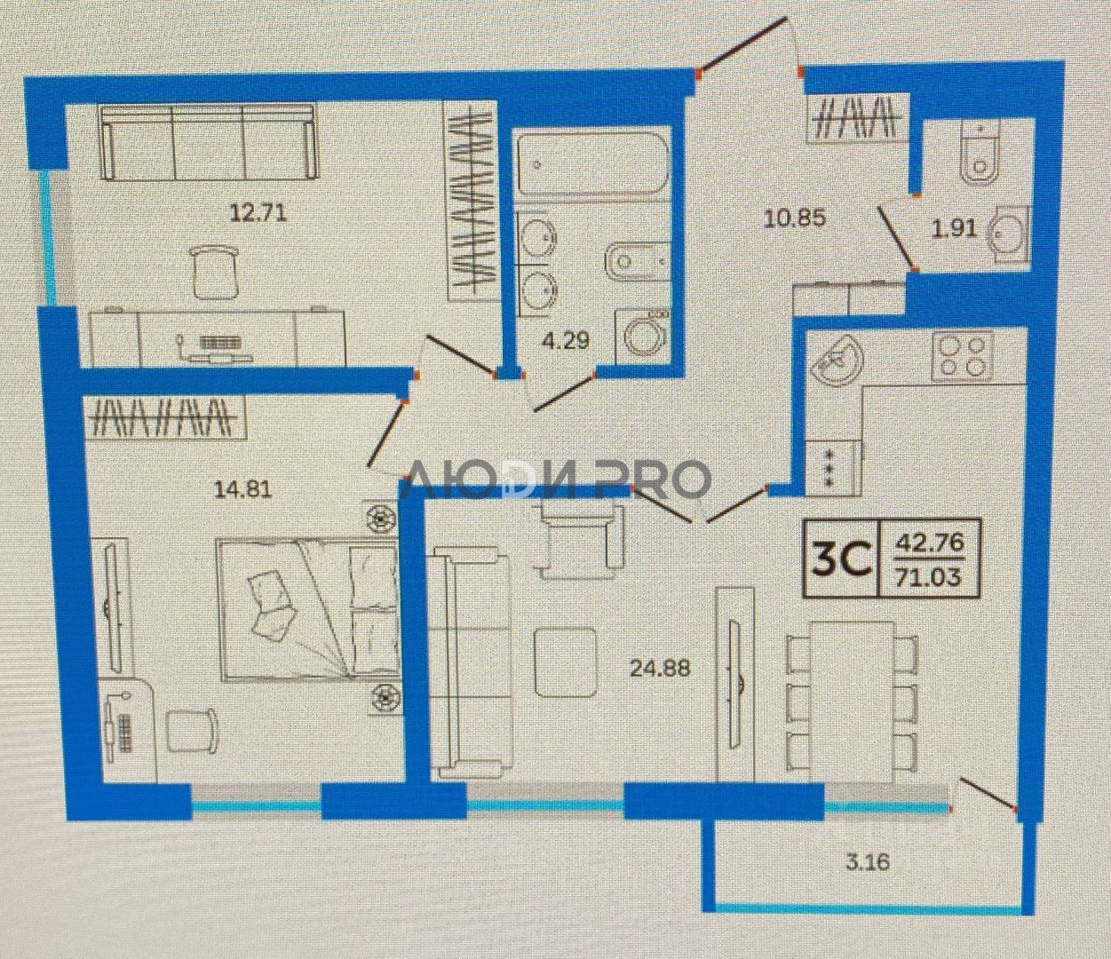 - жилая комната - 12, 71 кв.м.