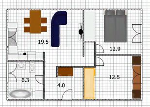 Площадь комнат: кухня-гостинная 19,5 метров; спальная комната 12,9 метров; детская 12,5 метров; ванная с тропическим душем 6,3 метра.