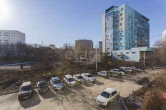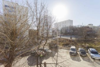 Квартира расположена на втором этаже кирпичного дома, что обеспечивает хорошую звукоизоляцию и тепло. Из окон открывается вид во двор, где есть детская площадка и парковка за шлагбаумом.