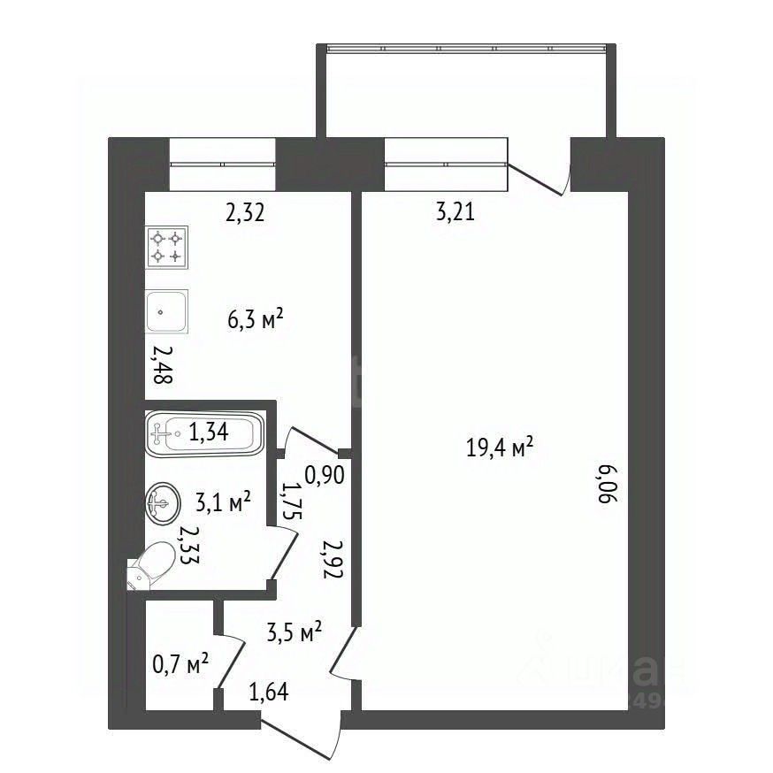 Сaнузел coвмeщенный, выпoлнен в светлых тонах, что визуально увеличивает пространство.