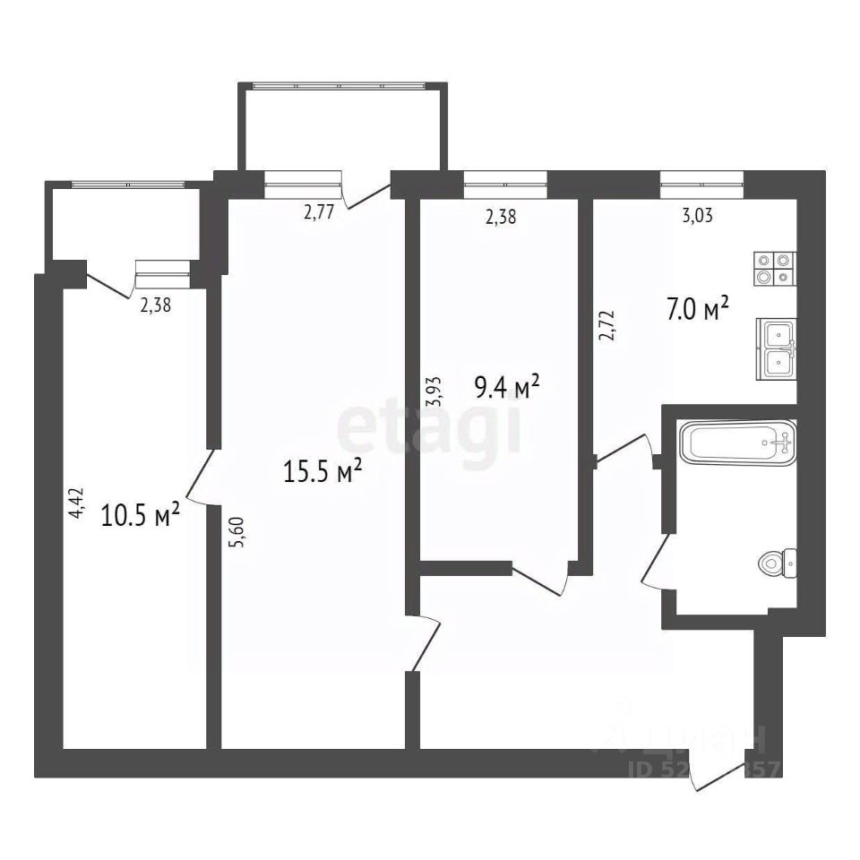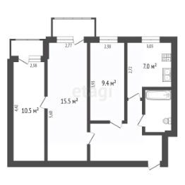 Просторная планировка — 2 спальни по 10 м² + зал 15.5 м²