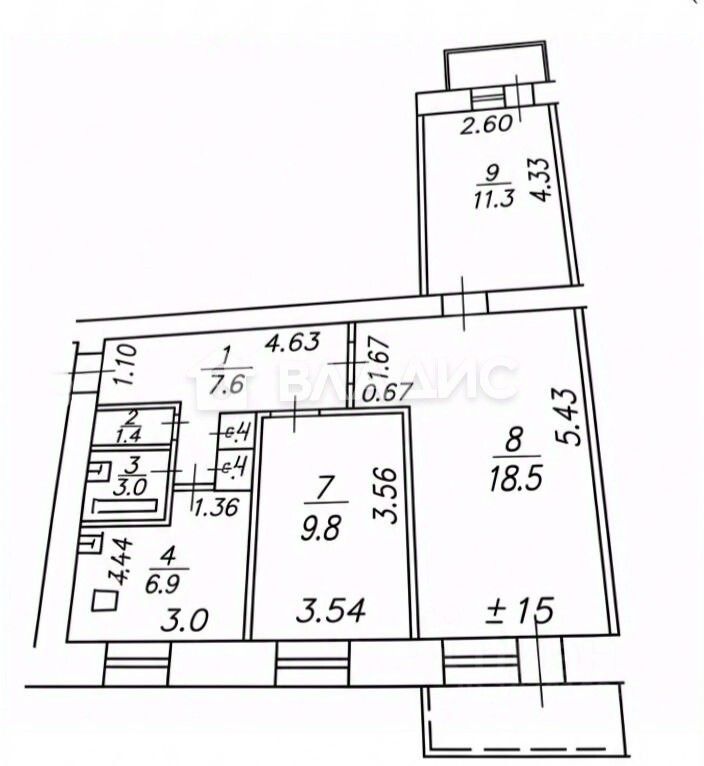 Площадь и планировка: общая площадь квартиры составляет 57,4 кв. м, из которых 39,6 кв. м — жилая площадь. Три комнаты с площадями 9,8 кв. м, 18,5 кв. м и 11,3 кв. м позволяют организовать пространство по своему вкусу. Высота потолков 2,5 м создаёт ощущение простора.