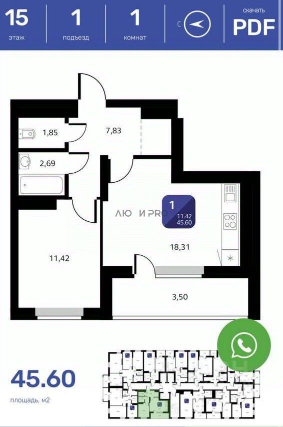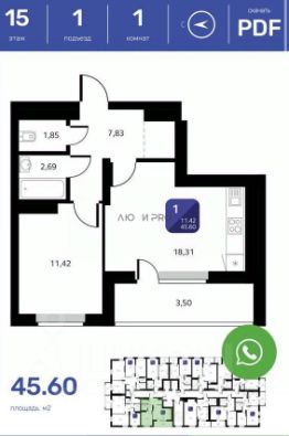 кухня-гостиная 18,31 кв м, спальня 11,42 кв м. Санузел раздельный. Лоджия 7 кв м. Есть ниша под гардероб. Этаж видовой, окна во двор.