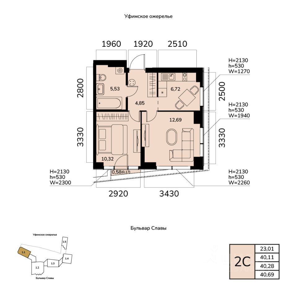 Общая площадь 40.28кв.м.;