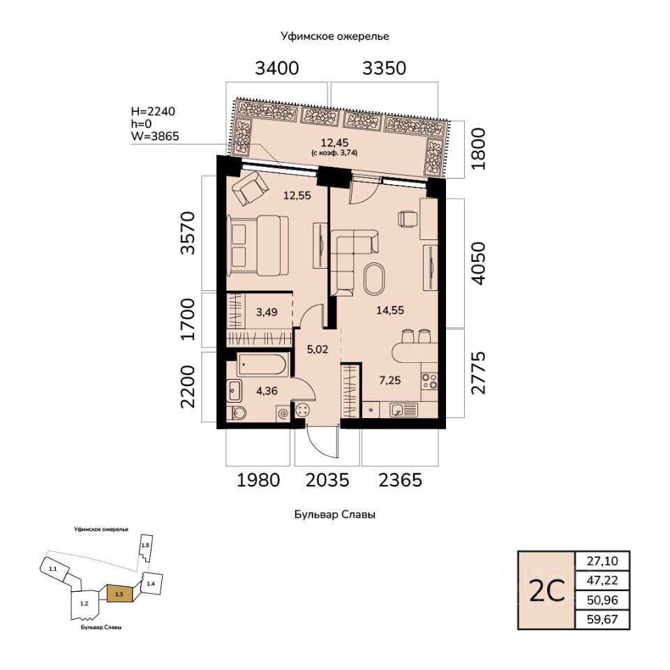 Общая площадь 50.96кв.м.;