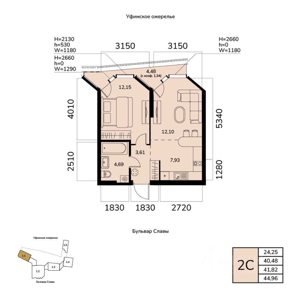 Общая площадь 41.82кв.м.;