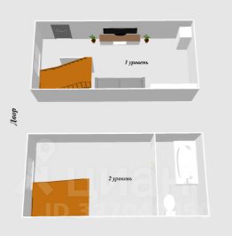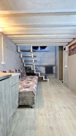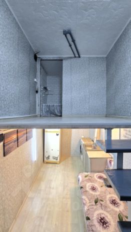 В квартире сделан косметический ремонт. На первом уровне имеется кухонная зона с раковиной, мини кухонным гарнитуром, стиральной машиной и холодильником, а также спальная зона. На втором уровне расположен совмещенный санузел с полноценной ванной, а также свободная зона, где можно разместить как спальное место, так и зону отдыха.