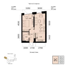 Общая площадь 47.43кв.м.;