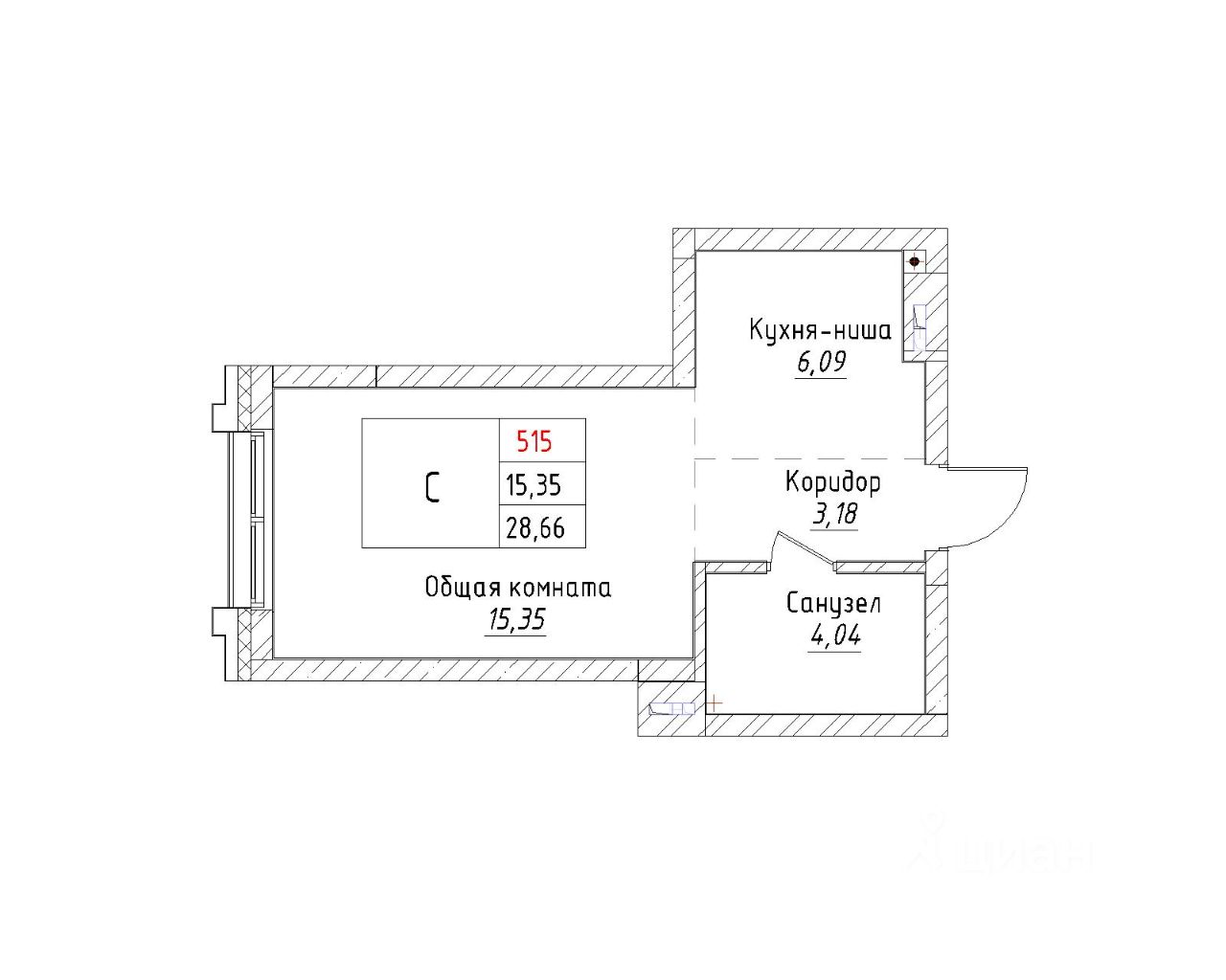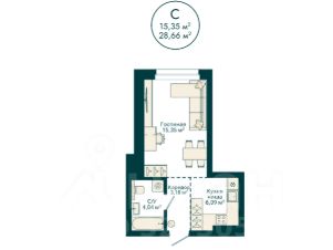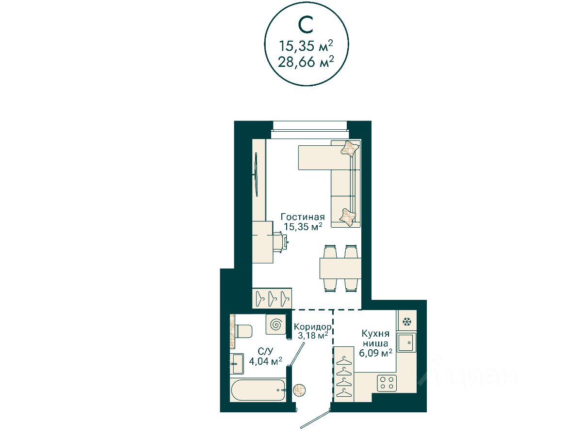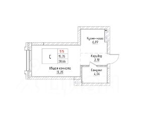 Ваша будущая студия 28,66 кв.м. с продуманной планировкой: