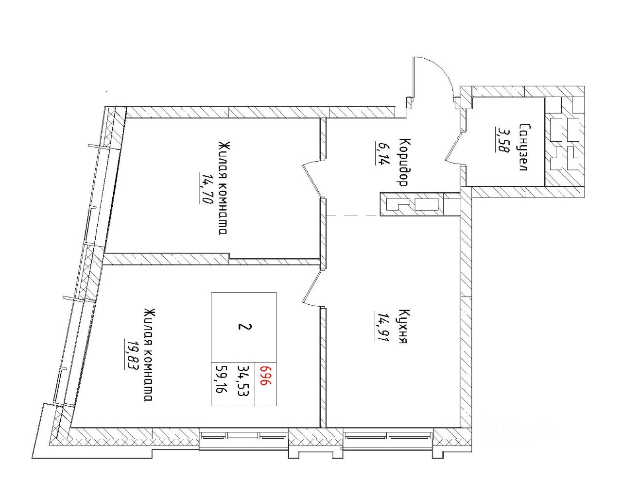 Ваша будущая 2 комнатная квартира 59,16 кв.м. с продуманной планировкой: