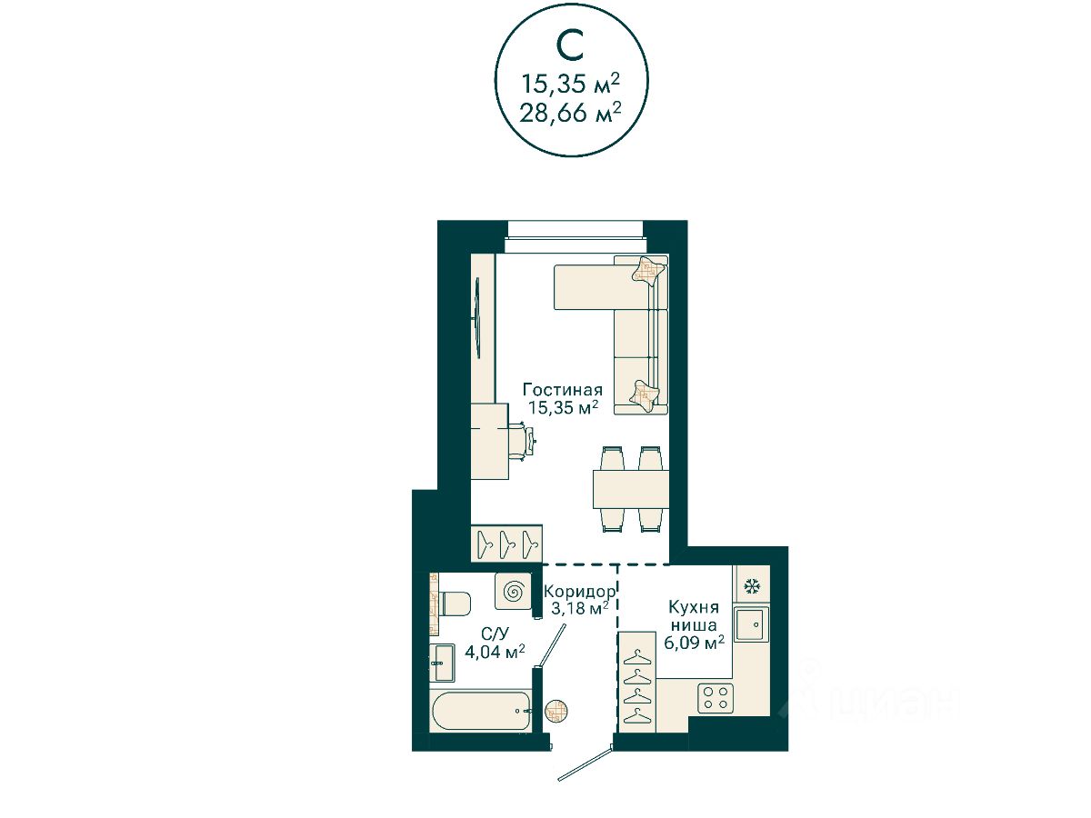 Ваша будущая студия 28,66 кв.м. с продуманной планировкой: