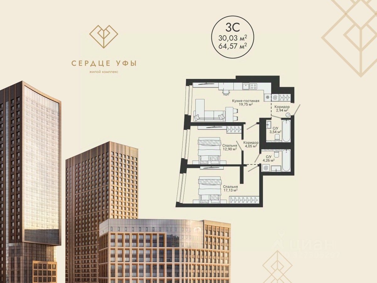 Ваша будущая 3 комнатная квартира 64,57 кв.м. с продуманной планировкой: спальня — 17,13; 12,90 кв.м. кухня-гостиная — 19,75 кв.м. прихожая — 2,94 кв.м. высота потолков — 2,7 кв.м. отделка — предчистовая Успейте купить по выгодным ценам на старте продаж! Подберем лучшую программу покупки для вас: Семейная ипотека IT-ипотека Военная ипотека Стандартная ипотека Готовая жизнь "здесь и сейчас": Потолки до 3 м Паркинг — более 800 машиномест, в том числе подземные, надземные и гостевые места Закрытый двор, охрана, видеонаблюдение по периметру и в подъездах 237 кладовых Площадки для выгула собак Воркаут-зоны и велодорожки Здесь формируется сообщество, где ценят надежность, статус и функциональность пространства для всей семьи. ЖК "Сердце Уфы" — место "не в центре", а в сердце Уфы. Здесь вы сохраните связь с природой и любовь к активному отдыху и будете пользоваться всеми преимуществами городской и транспортной инфраструктуры. Транспортная доступность: 5 минут до проспекта Салавата Юлаева 15 минут до центра города 5 минут пешей прогулки до ближайших остановок 12 минут до выезда из города Можно за 5 минут доехать до зеленого массива при ул. Рихарда Зорге и лесопарка за ул. Менделеева с горнолыжным склоном и трассой для беговых лыж. Еще ближе — до зоны тропы здоровья "Театральная". "Сердце Уфы" — центр притяжения вашей жизни. Все важное для семьи — в пешей доступности. От детского развития до спорта премиум-класса. Это место для динамичного ритма жизни в режиме многозадачности семьи. Дом находится в районе с развитой социальной инфраструктурой. В пешей доступности: детские сады, школы поликлиники, аптеки, медцентр магазины, ПВЗ фитнес-клубы, спа, салоны красоты, рестораны До ТЦ "Планета" — 4 минуты на авто. Успейте оформить сделку по выгодной цене на старте продаж. Приходите в наш офис продаж на чашечку кофе, чтобы лично узнать все детали и забронировать квартиру вашей мечты. Напишите или позвоните нам, чтобы назначить встречу!