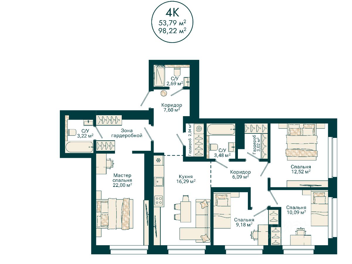 Ваша будущая 4 комнатная квартира 98,22 кв.м. с продуманной планировкой: спальня — 12,52; 10,09; 9,18 кв.м. кухня-гостиная — 16,29 кв.м. прихожая — 7,6 кв.м. высота потолков — 2,7 кв.м. отделка — предчистовая Успейте купить по выгодным ценам на старте продаж! Подберем лучшую программу покупки для вас: Семейная ипотека IT-ипотека Военная ипотека Стандартная ипотека Готовая жизнь "здесь и сейчас": Потолки до 3 м Паркинг — более 800 машиномест, в том числе подземные, надземные и гостевые места Закрытый двор, охрана, видеонаблюдение по периметру и в подъездах 237 кладовых Площадки для выгула собак Воркаут-зоны и велодорожки Здесь формируется сообщество, где ценят надежность, статус и функциональность пространства для всей семьи. ЖК "Сердце Уфы" — место "не в центре", а в сердце Уфы. Здесь вы сохраните связь с природой и любовь к активному отдыху и будете пользоваться всеми преимуществами городской и транспортной инфраструктуры. Транспортная доступность: 5 минут до проспекта Салавата Юлаева 15 минут до центра города 5 минут пешей прогулки до ближайших остановок 12 минут до выезда из города Можно за 5 минут доехать до зеленого массива при ул. Рихарда Зорге и лесопарка за ул. Менделеева с горнолыжным склоном и трассой для беговых лыж. Еще ближе — до зоны тропы здоровья "Театральная". "Сердце Уфы" — центр притяжения вашей жизни. Все важное для семьи — в пешей доступности. От детского развития до спорта премиум-класса. Это место для динамичного ритма жизни в режиме многозадачности семьи. Дом находится в районе с развитой социальной инфраструктурой. В пешей доступности: детские сады, школы поликлиники, аптеки, медцентр магазины, ПВЗ фитнес-клубы, спа, салоны красоты, рестораны До ТЦ "Планета" — 4 минуты на авто. Успейте оформить сделку по выгодной цене на старте продаж. Приходите в наш офис продаж на чашечку кофе, чтобы лично узнать все детали и забронировать квартиру вашей мечты. Напишите или позвоните нам, чтобы назначить встречу!