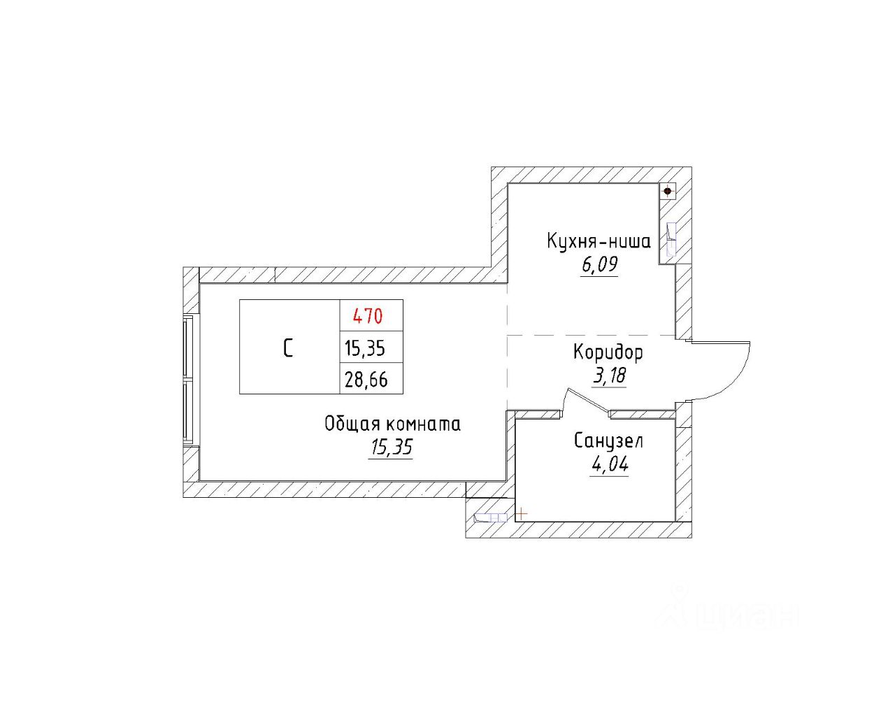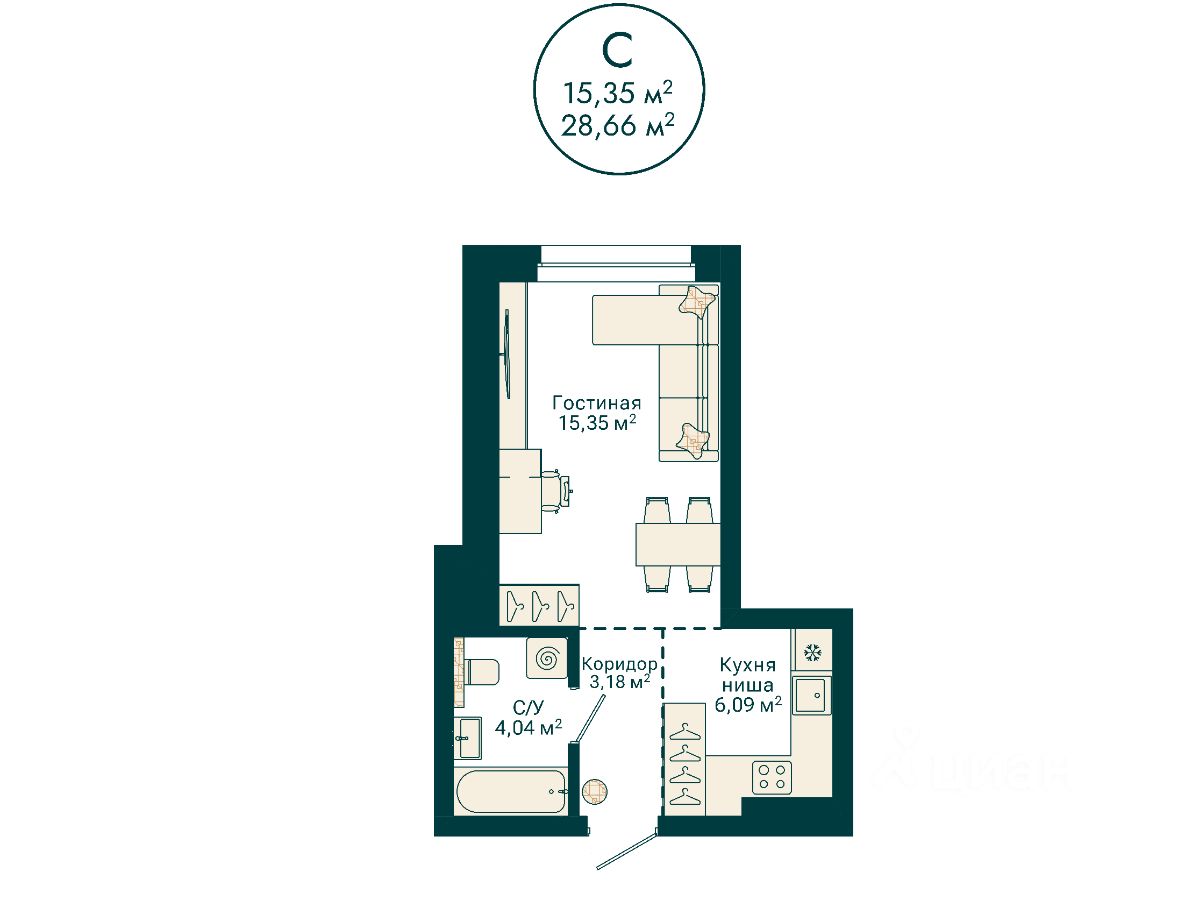 Ваша будущая студия 28,66 кв.м. с продуманной планировкой: