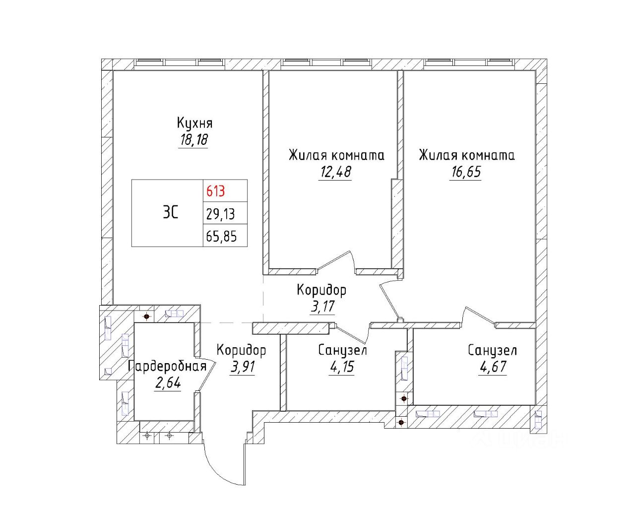 Ваша будущая 3 комнатная квартира 65,85 кв.м. с продуманной планировкой: