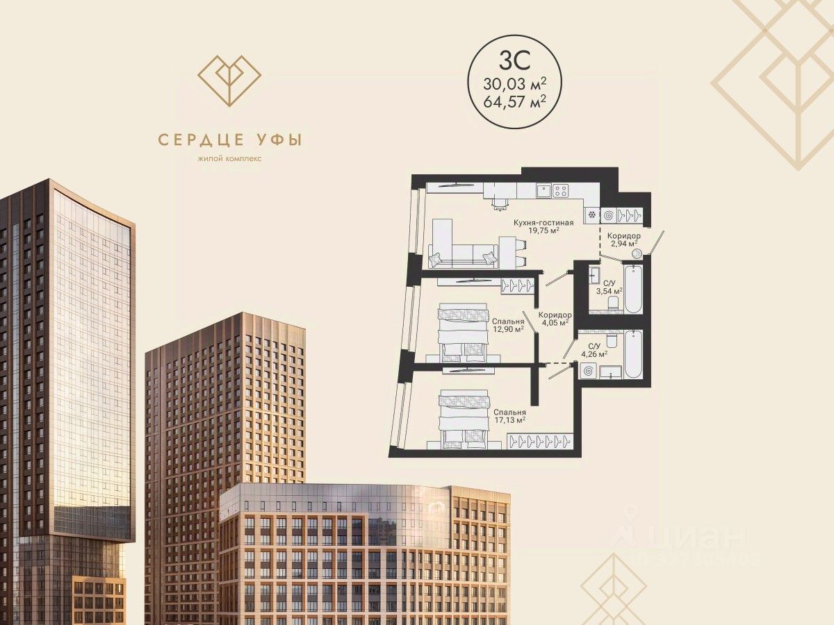 Ваша будущая 3 комнатная квартира 64,57 кв.м. с продуманной планировкой: