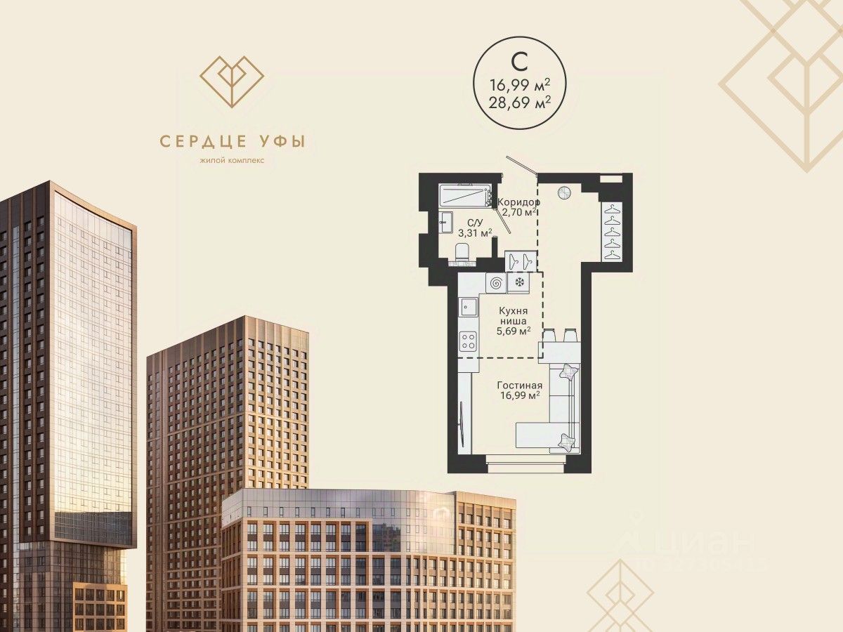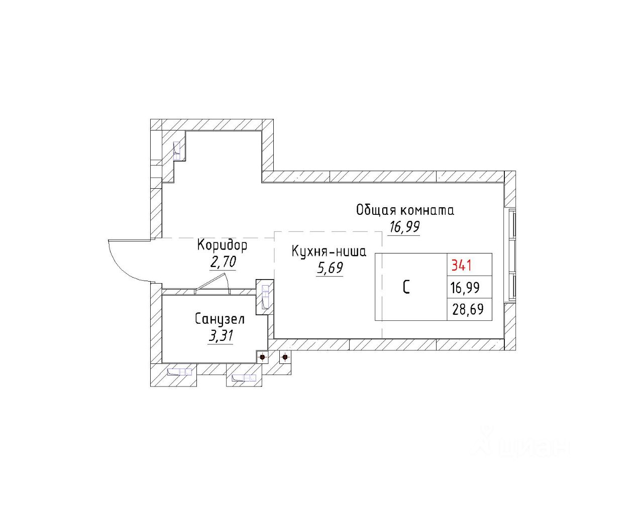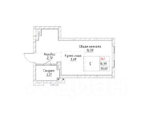Ваша будущая студия 28,69 кв.м. с продуманной планировкой: