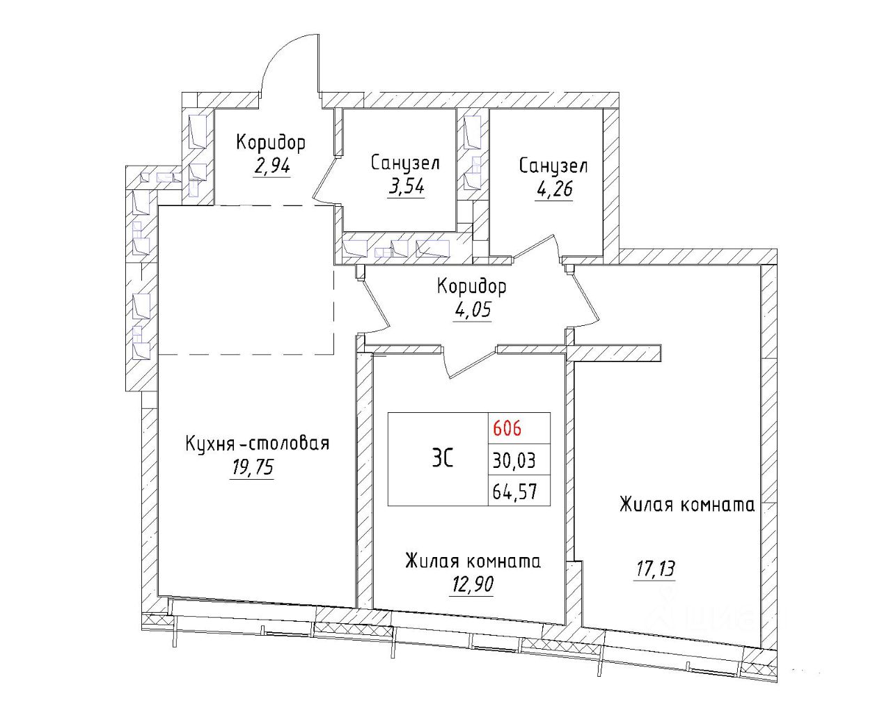 Ваша будущая 3 комнатная квартира 64,57 кв.м. с продуманной планировкой: