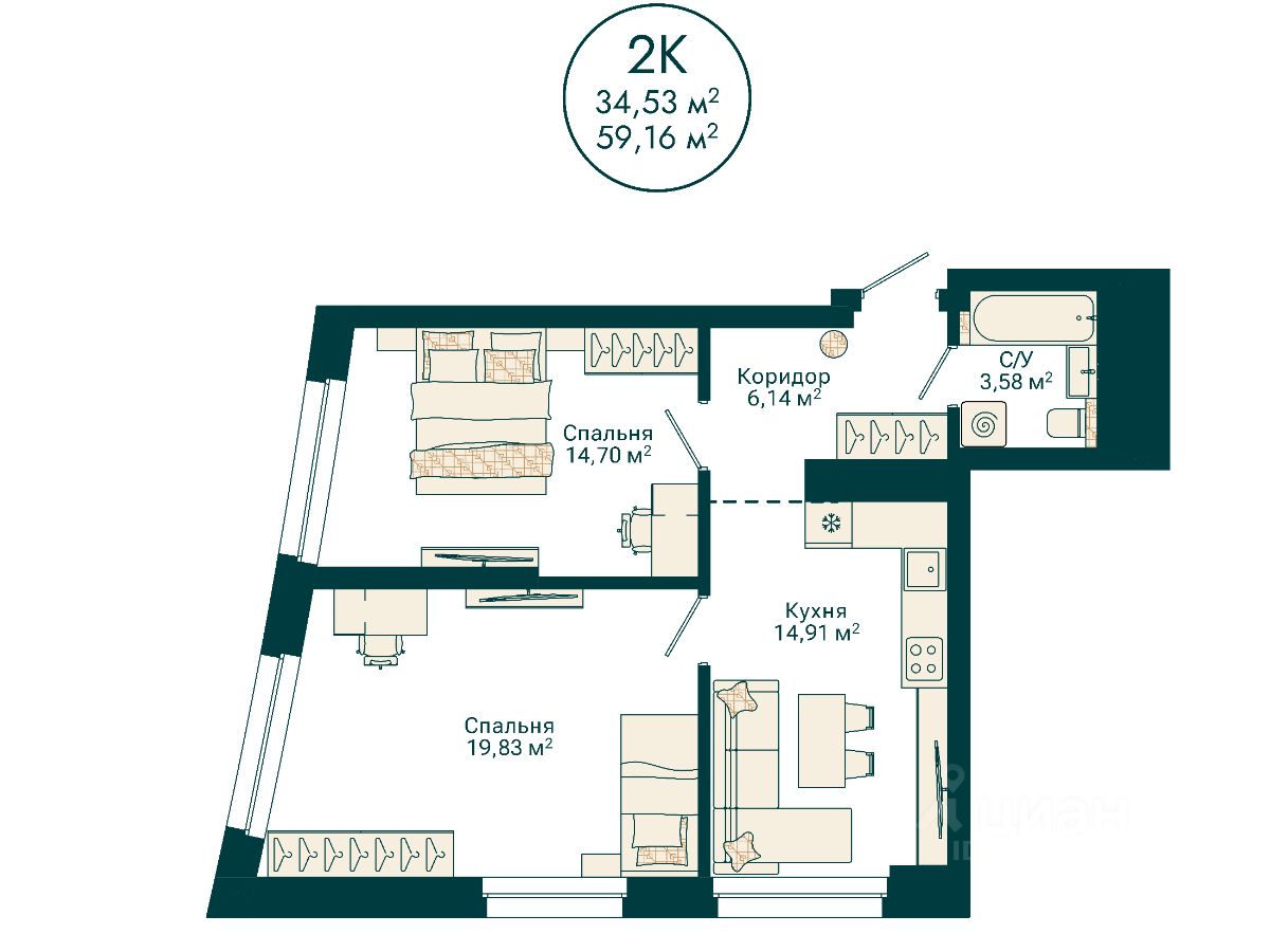 Ваша будущая 2 комнатная квартира 59,16 кв.м. с продуманной планировкой: