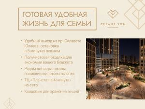"Сердце Уфы" — центр притяжения вашей жизни. Все важное для семьи — в пешей доступности. От детского развития до спорта премиум-класса. Это место для динамичного ритма жизни в режиме многозадачности семьи. Дом находится в районе с развитой социальной инфраструктурой.