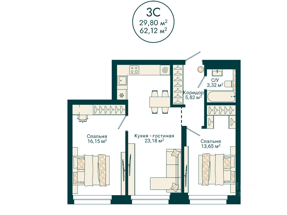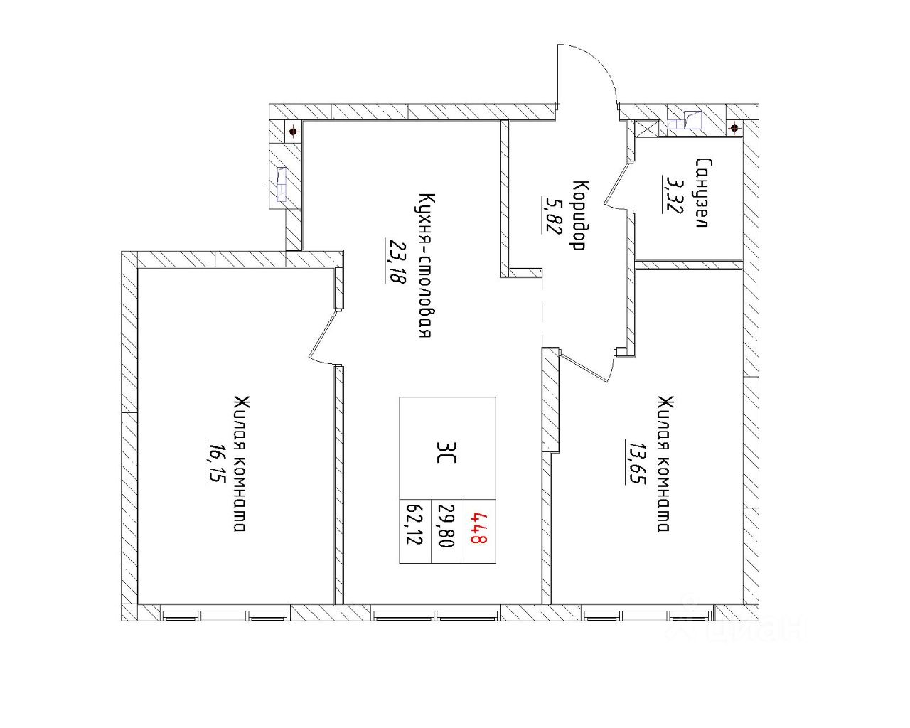 Ваша будущая 3 комнатная квартира 62,12 кв.м. с продуманной планировкой: