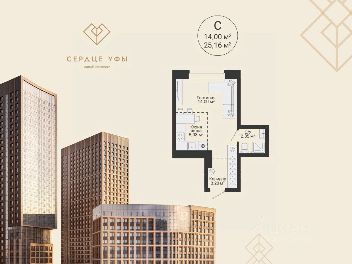 Ваша будущая студия 25,16 кв.м. с продуманной планировкой: спальня — 14 кв.м. кухня-гостиная — 5,03 кв.м. прихожая — 3,28 кв.м. санузел совмещенный — 2,85 кв.м. высота потолков — 2,7 кв.м. отделка — предчистовая Успейте купить по выгодным ценам на старте продаж! Подберем лучшую программу покупки для вас: Семейная ипотека IT-ипотека Военная ипотека Стандартная ипотека Готовая жизнь "здесь и сейчас": Потолки до 3 м Паркинг — более 800 машиномест, в том числе подземные, надземные и гостевые места Закрытый двор, охрана, видеонаблюдение по периметру и в подъездах 237 кладовых Площадки для выгула собак Воркаут-зоны и велодорожки Здесь формируется сообщество, где ценят надежность, статус и функциональность пространства для всей семьи. ЖК "Сердце Уфы" — место "не в центре", а в сердце Уфы. Здесь вы сохраните связь с природой и любовь к активному отдыху и будете пользоваться всеми преимуществами городской и транспортной инфраструктуры. Транспортная доступность: 5 минут до проспекта Салавата Юлаева 15 минут до центра города 5 минут пешей прогулки до ближайших остановок 12 минут до выезда из города Можно за 5 минут доехать до зеленого массива при ул. Рихарда Зорге и лесопарка за ул. Менделеева с горнолыжным склоном и трассой для беговых лыж. Еще ближе — до зоны тропы здоровья "Театральная". "Сердце Уфы" — центр притяжения вашей жизни. Все важное для семьи — в пешей доступности. От детского развития до спорта премиум-класса. Это место для динамичного ритма жизни в режиме многозадачности семьи. Дом находится в районе с развитой социальной инфраструктурой. В пешей доступности: детские сады, школы поликлиники, аптеки, медцентр магазины, ПВЗ фитнес-клубы, спа, салоны красоты, рестораны До ТЦ "Планета" — 4 минуты на авто. Успейте оформить сделку по выгодной цене на старте продаж. Приходите в наш офис продаж на чашечку кофе, чтобы лично узнать все детали и забронировать квартиру вашей мечты. Напишите или позвоните нам, чтобы назначить встречу!