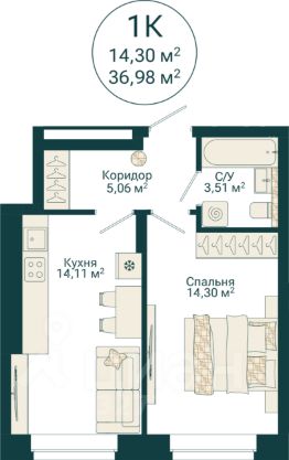 Ваша будущая 1 комнатная квартира 36,98 кв.м. с продуманной планировкой: