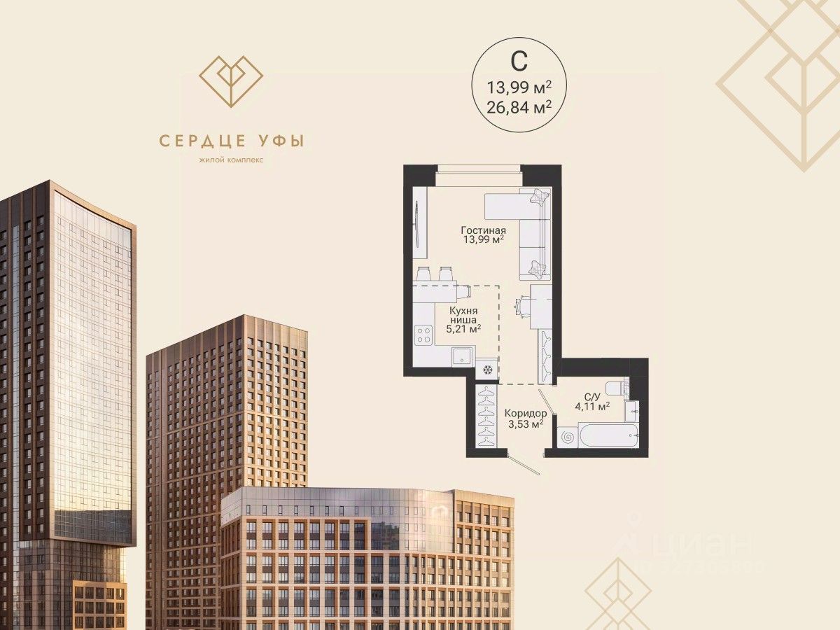 Ваша будущая студия 26,84 кв.м. с продуманной планировкой: спальня — 13,99 кв.м. кухня-гостиная — 5,21 кв.м. прихожая — 3,53 кв.м. санузел совмещенный — 4,11 кв.м. высота потолков — 2,7 кв.м. отделка — предчистовая Успейте купить по выгодным ценам на старте продаж! Подберем лучшую программу покупки для вас: Семейная ипотека IT-ипотека Военная ипотека Стандартная ипотека Готовая жизнь "здесь и сейчас": Потолки до 3 м Паркинг — более 800 машиномест, в том числе подземные, надземные и гостевые места Закрытый двор, охрана, видеонаблюдение по периметру и в подъездах 237 кладовых Площадки для выгула собак Воркаут-зоны и велодорожки Здесь формируется сообщество, где ценят надежность, статус и функциональность пространства для всей семьи. ЖК "Сердце Уфы" — место "не в центре", а в сердце Уфы. Здесь вы сохраните связь с природой и любовь к активному отдыху и будете пользоваться всеми преимуществами городской и транспортной инфраструктуры. Транспортная доступность: 5 минут до проспекта Салавата Юлаева 15 минут до центра города 5 минут пешей прогулки до ближайших остановок 12 минут до выезда из города Можно за 5 минут доехать до зеленого массива при ул. Рихарда Зорге и лесопарка за ул. Менделеева с горнолыжным склоном и трассой для беговых лыж. Еще ближе — до зоны тропы здоровья "Театральная". "Сердце Уфы" — центр притяжения вашей жизни. Все важное для семьи — в пешей доступности. От детского развития до спорта премиум-класса. Это место для динамичного ритма жизни в режиме многозадачности семьи. Дом находится в районе с развитой социальной инфраструктурой. В пешей доступности: детские сады, школы поликлиники, аптеки, медцентр магазины, ПВЗ фитнес-клубы, спа, салоны красоты, рестораны До ТЦ "Планета" — 4 минуты на авто. Успейте оформить сделку по выгодной цене на старте продаж. Приходите в наш офис продаж на чашечку кофе, чтобы лично узнать все детали и забронировать квартиру вашей мечты. Напишите или позвоните нам, чтобы назначить встречу!