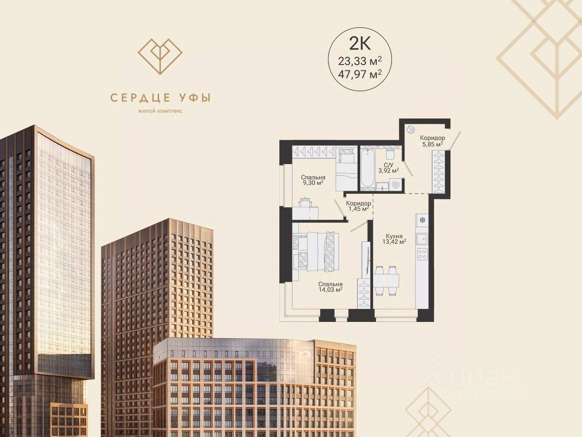 Ваша будущая 2 комнатная квартира 47,97 кв.м. с продуманной планировкой: спальня — 14,3; 9,30 кв.м. кухня-гостиная — 13,42 кв.м. прихожая — 5,85 кв.м. санузел совмещенный — 3,92 кв.м. высота потолков — 2,7 кв.м. отделка — предчистовая Успейте купить по выгодным ценам на старте продаж! Подберем лучшую программу покупки для вас: Семейная ипотека IT-ипотека Военная ипотека Стандартная ипотека Готовая жизнь "здесь и сейчас": Потолки до 3 м Паркинг — более 800 машиномест, в том числе подземные, надземные и гостевые места Закрытый двор, охрана, видеонаблюдение по периметру и в подъездах 237 кладовых Площадки для выгула собак Воркаут-зоны и велодорожки Здесь формируется сообщество, где ценят надежность, статус и функциональность пространства для всей семьи. ЖК "Сердце Уфы" — место "не в центре", а в сердце Уфы. Здесь вы сохраните связь с природой и любовь к активному отдыху и будете пользоваться всеми преимуществами городской и транспортной инфраструктуры. Транспортная доступность: 5 минут до проспекта Салавата Юлаева 15 минут до центра города 5 минут пешей прогулки до ближайших остановок 12 минут до выезда из города Можно за 5 минут доехать до зеленого массива при ул. Рихарда Зорге и лесопарка за ул. Менделеева с горнолыжным склоном и трассой для беговых лыж. Еще ближе — до зоны тропы здоровья "Театральная". "Сердце Уфы" — центр притяжения вашей жизни. Все важное для семьи — в пешей доступности. От детского развития до спорта премиум-класса. Это место для динамичного ритма жизни в режиме многозадачности семьи. Дом находится в районе с развитой социальной инфраструктурой. В пешей доступности: детские сады, школы поликлиники, аптеки, медцентр магазины, ПВЗ фитнес-клубы, спа, салоны красоты, рестораны До ТЦ "Планета" — 4 минуты на авто. Успейте оформить сделку по выгодной цене на старте продаж. Приходите в наш офис продаж на чашечку кофе, чтобы лично узнать все детали и забронировать квартиру вашей мечты. Напишите или позвоните нам, чтобы назначить встречу!