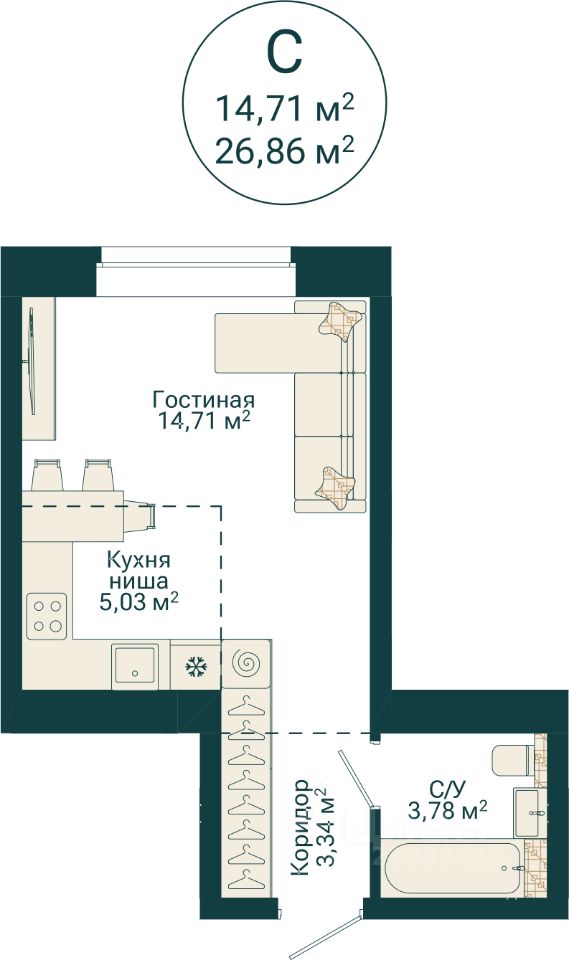Ваша будущая студия 26,86 кв.м. с продуманной планировкой: