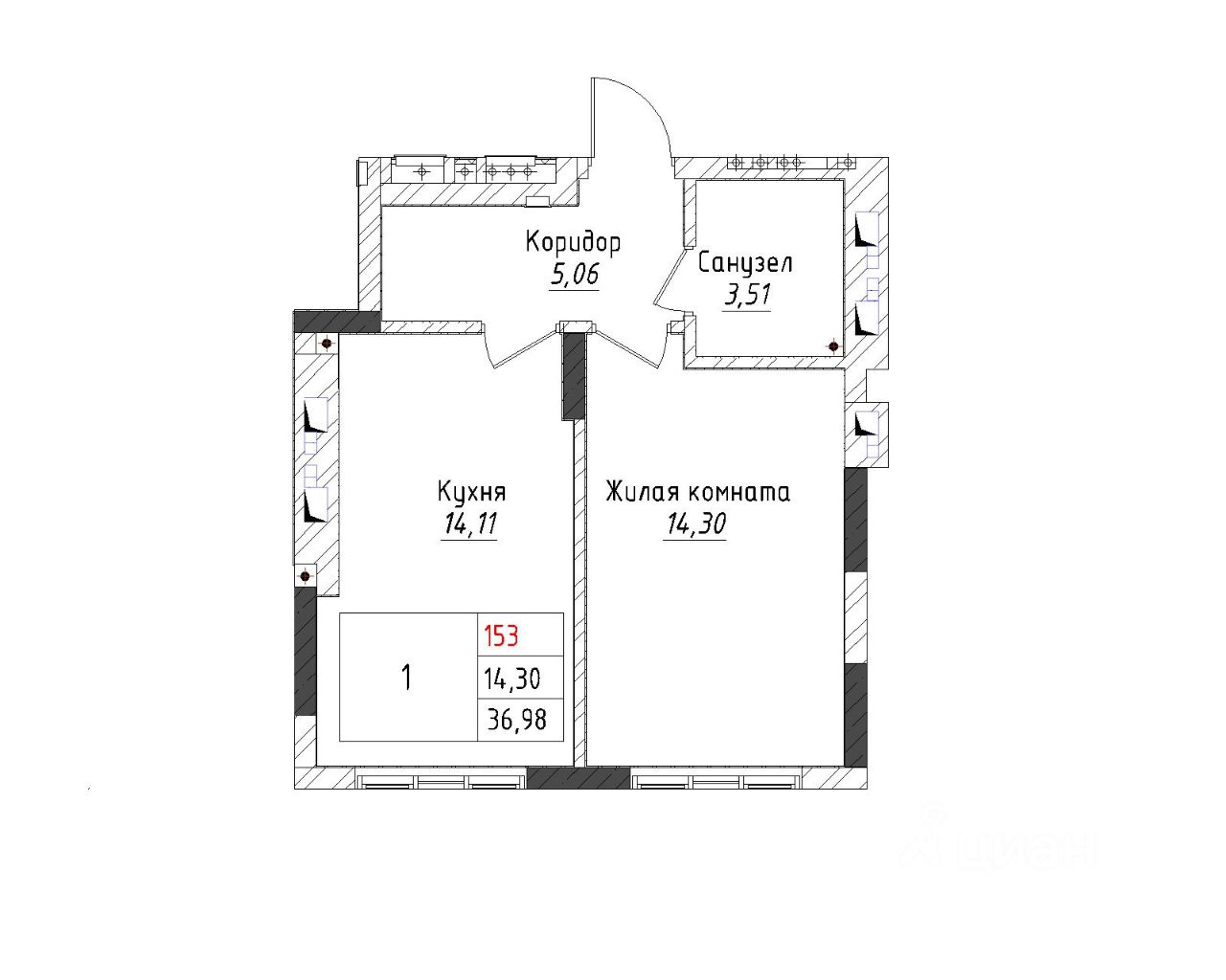 Ваша будущая 1 комнатная квартира 36,98 кв.м. с продуманной планировкой: