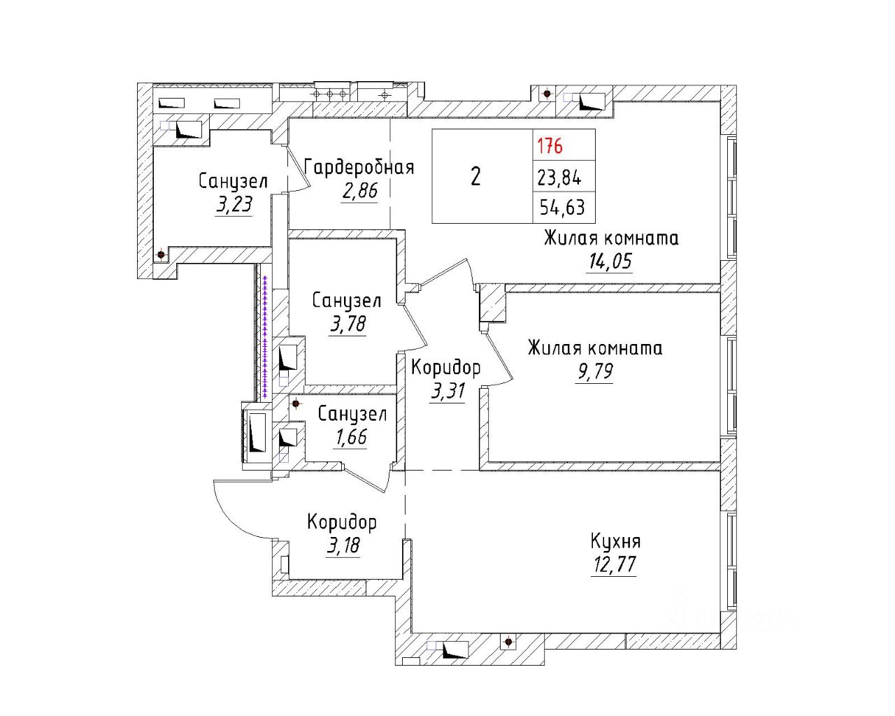 Ваша будущая 2 комнатная квартира 54,63 кв.м. с продуманной планировкой: