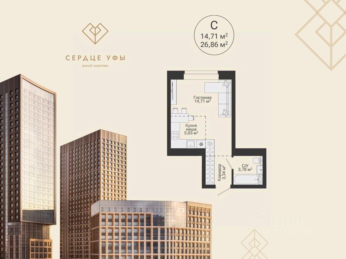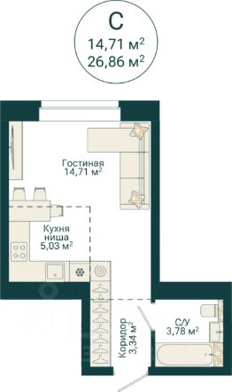 Ваша будущая студия 26,86 кв.м. с продуманной планировкой: