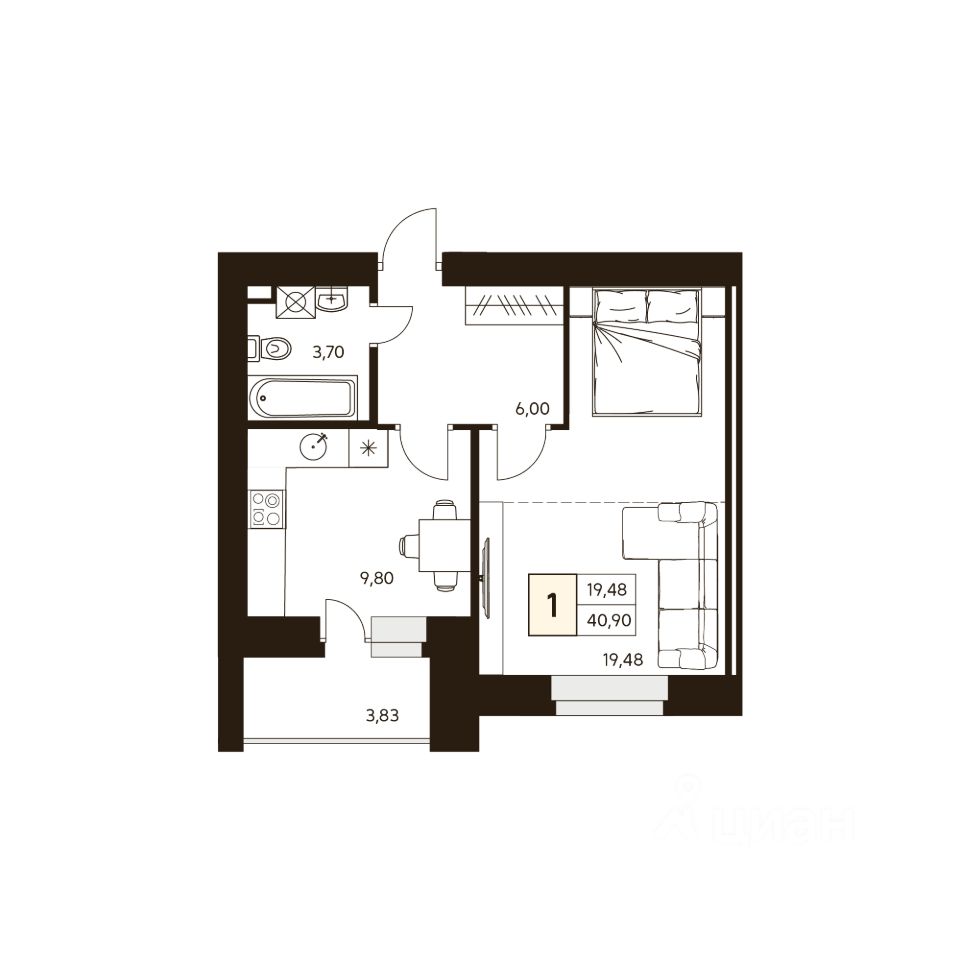Продаётся 1-комнатная квартира в сданном доме (Дом 3), срок сдачи: IV-кв. 2025, общей площадью 40.9 кв.м., на 10 этаже.