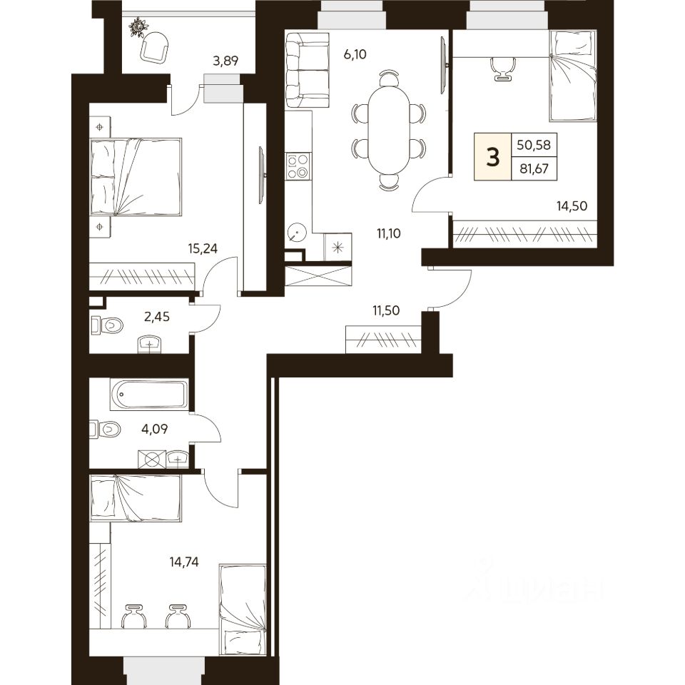Продаётся 3-комнатная квартира в сданном доме (Дом 3), срок сдачи: IV-кв. 2025, общей площадью 81.67 кв.м., на 2 этаже.
