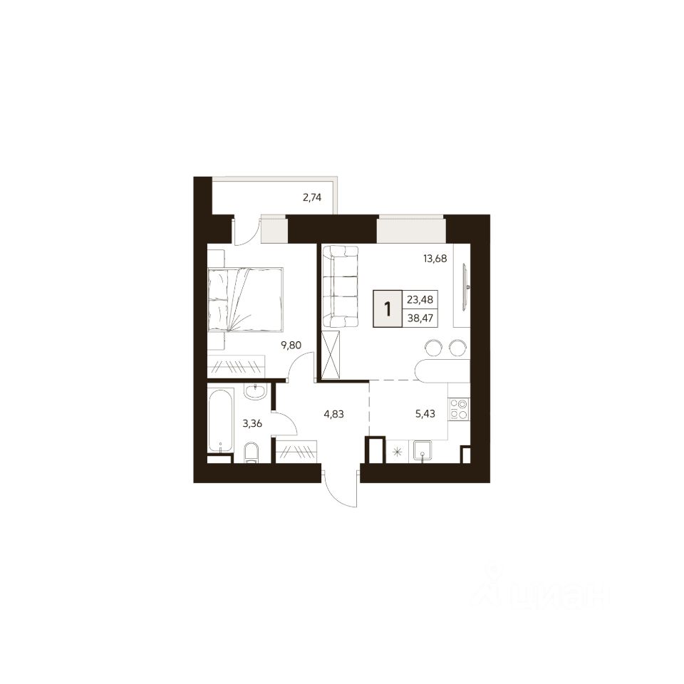 Продаётся 1-комнатная квартира в строящемся доме (Дом 2), срок сдачи: I-кв. 2026, общей площадью 38.47 кв.м., на 3 этаже.