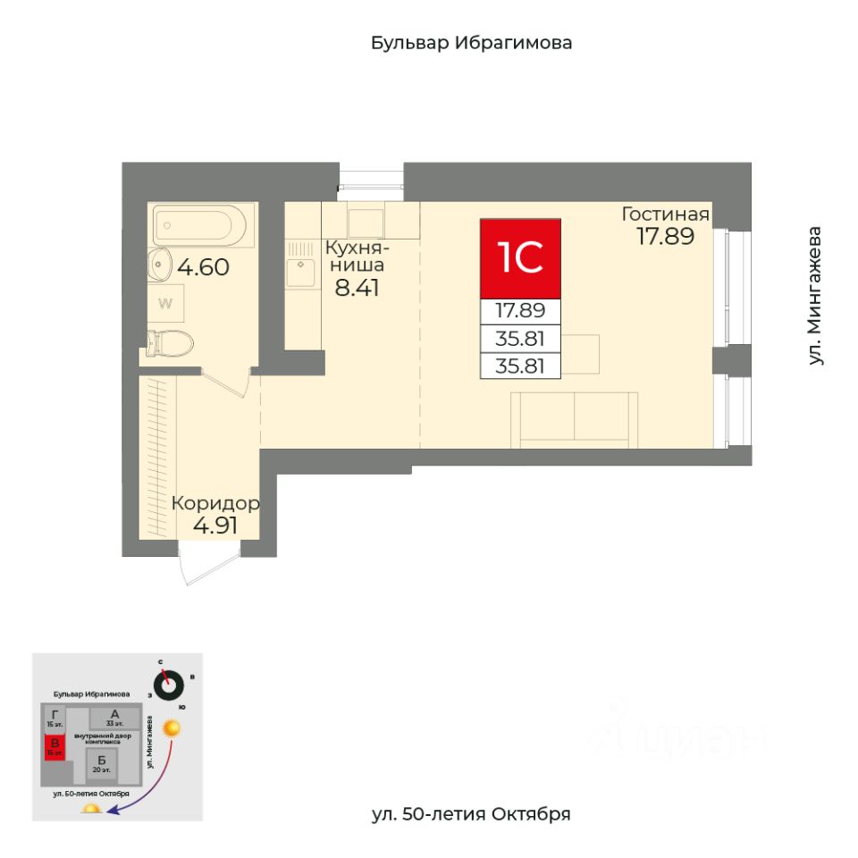 Жилая площадь 17.89 кв. м. от ГК "Первый Трест". Дом сдан.